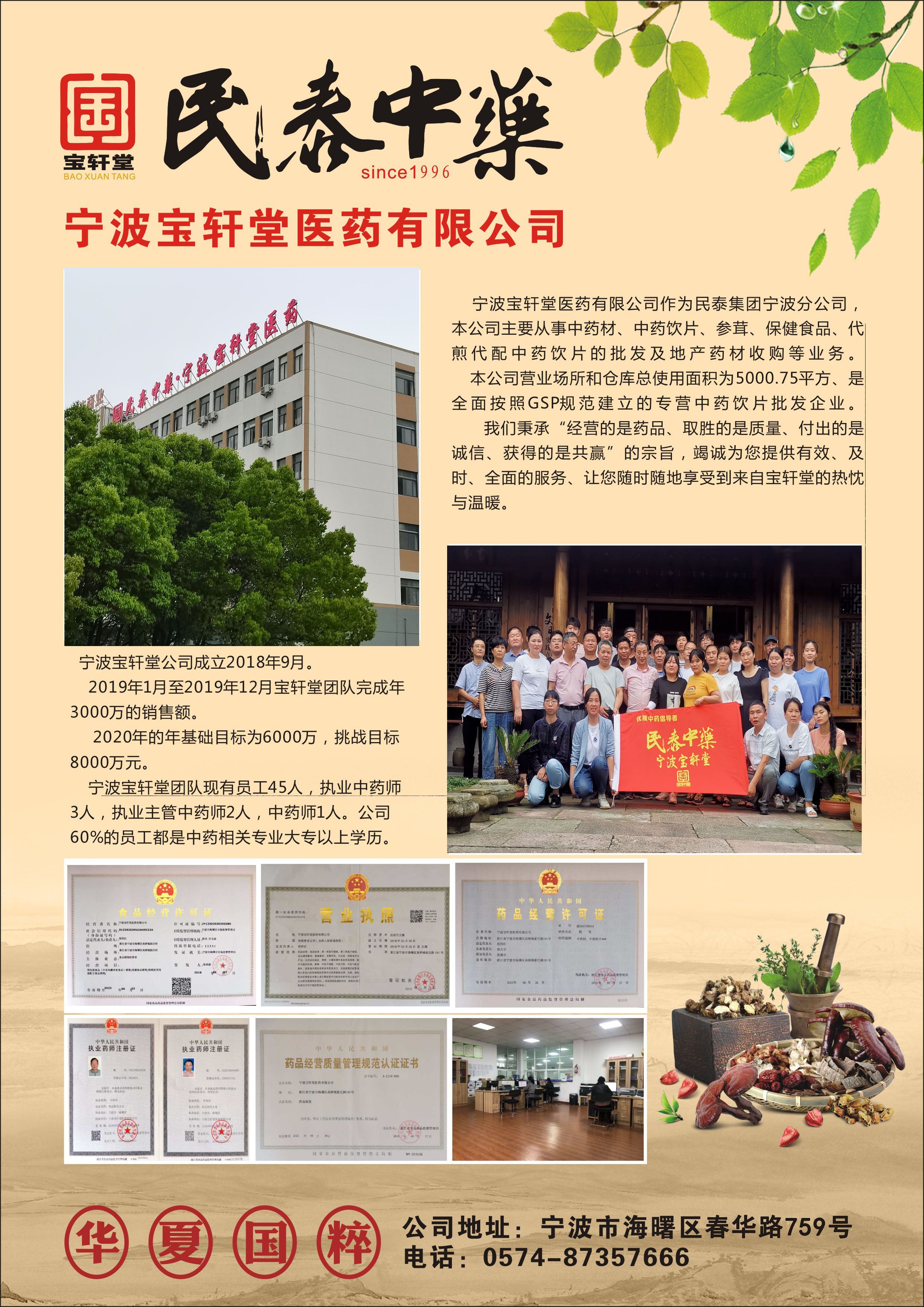 宁波宝轩堂医药有限公司是浙江民泰集团在宁波成立的分公司,公司注册资金500万元人民币,位于宁波市海曙区高桥镇春华路759号,经营面积5000平方米,是全面按照GSP规范建立的中药饮片、参茸、保健食品的批发企业。公司主要销售渠道有:医药公司批发调拨、各大医院、卫生院、各零售药店及连锁药店、中医馆批发配送业务。